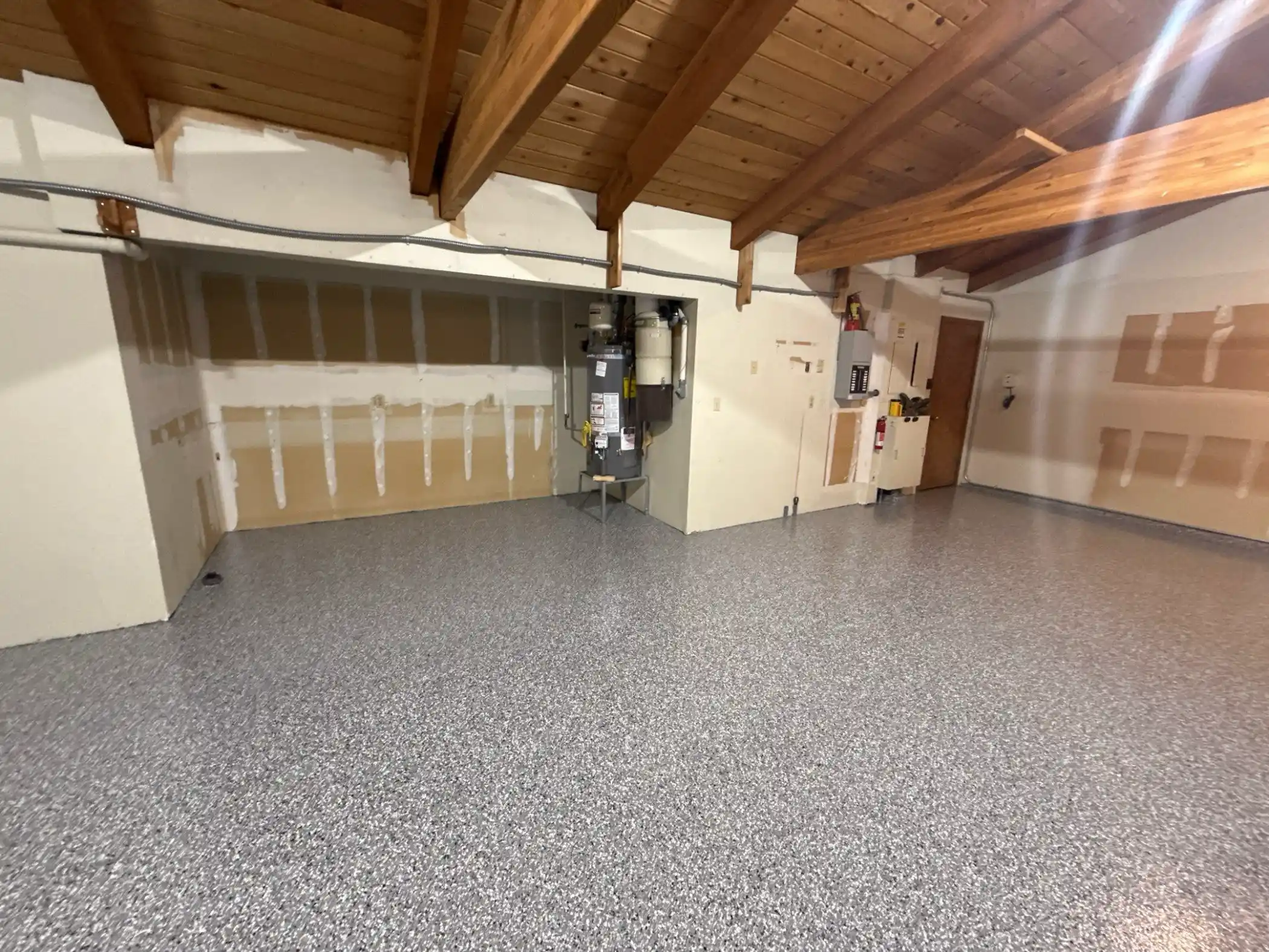 The prep work is where certified Penntek installations really separate themselves. This garage got diamond ground to open up the concrete at a microscopic level. That creates an actual chemical bond instead of just sticking on the surface. All the cracks got repaired properly because even small ones will cause problems down the road. Then came the Penntek base coat, the Smoke flakes broadcast evenly across everything for texture and traction, and finally the clear topcoat that gives you that glossy finish and seals it all in. The whole thing takes about a day, and you're back to using your garage the next day. Way better than waiting around for days while epoxy cures.