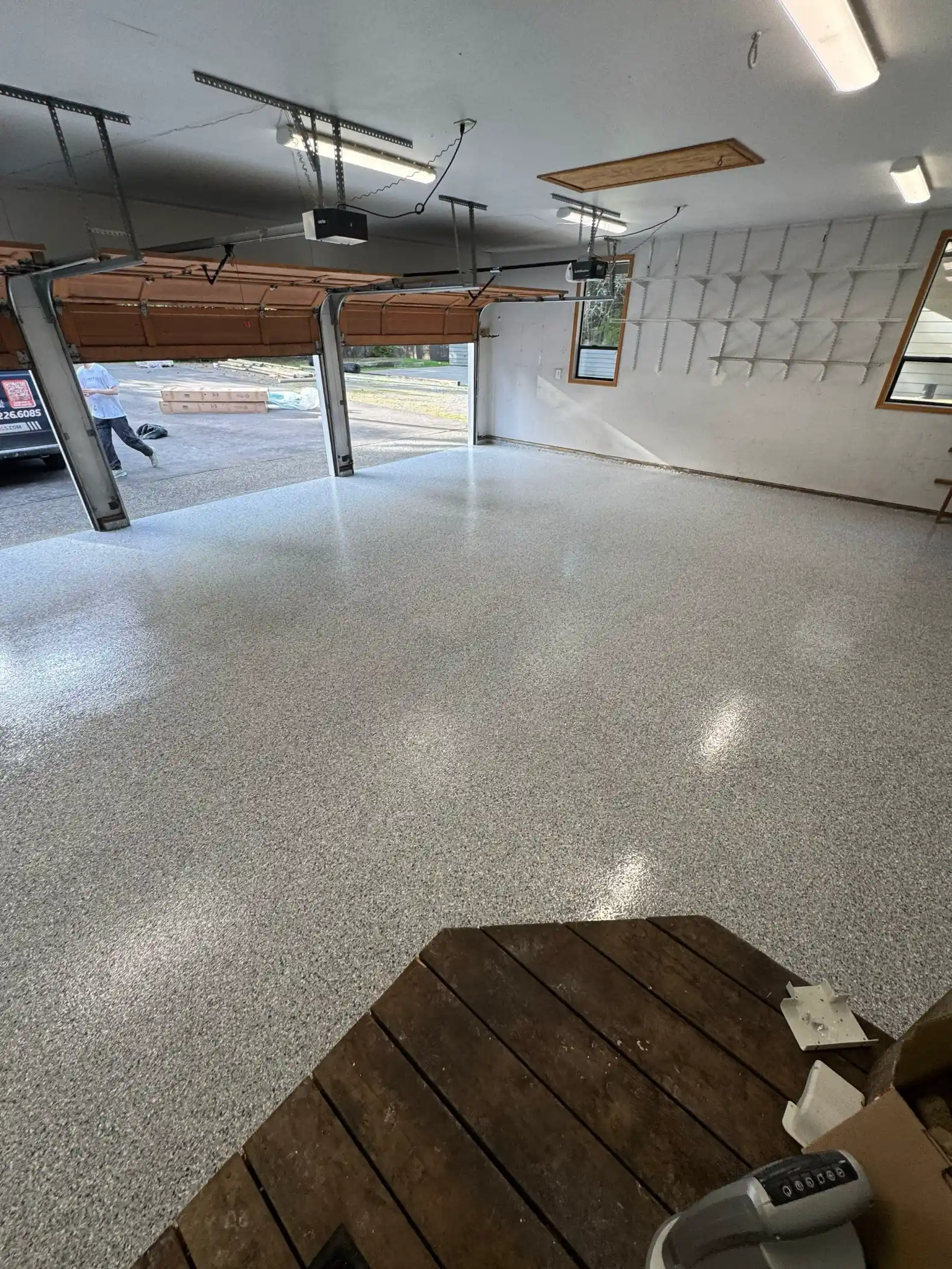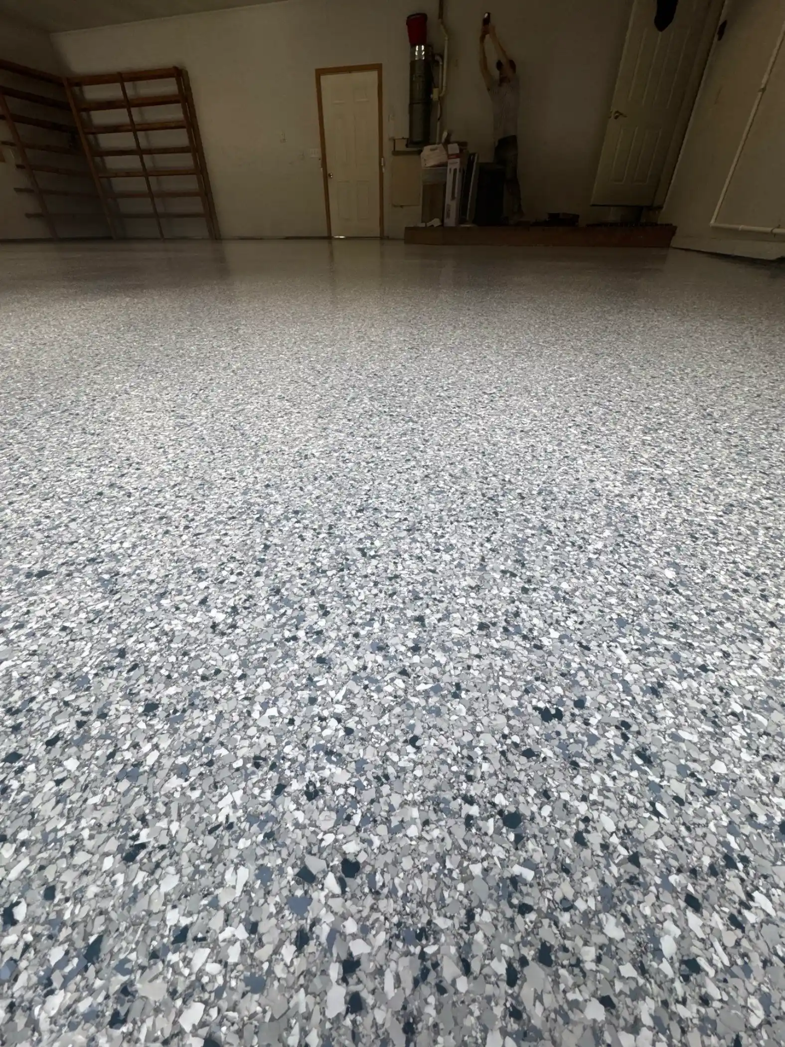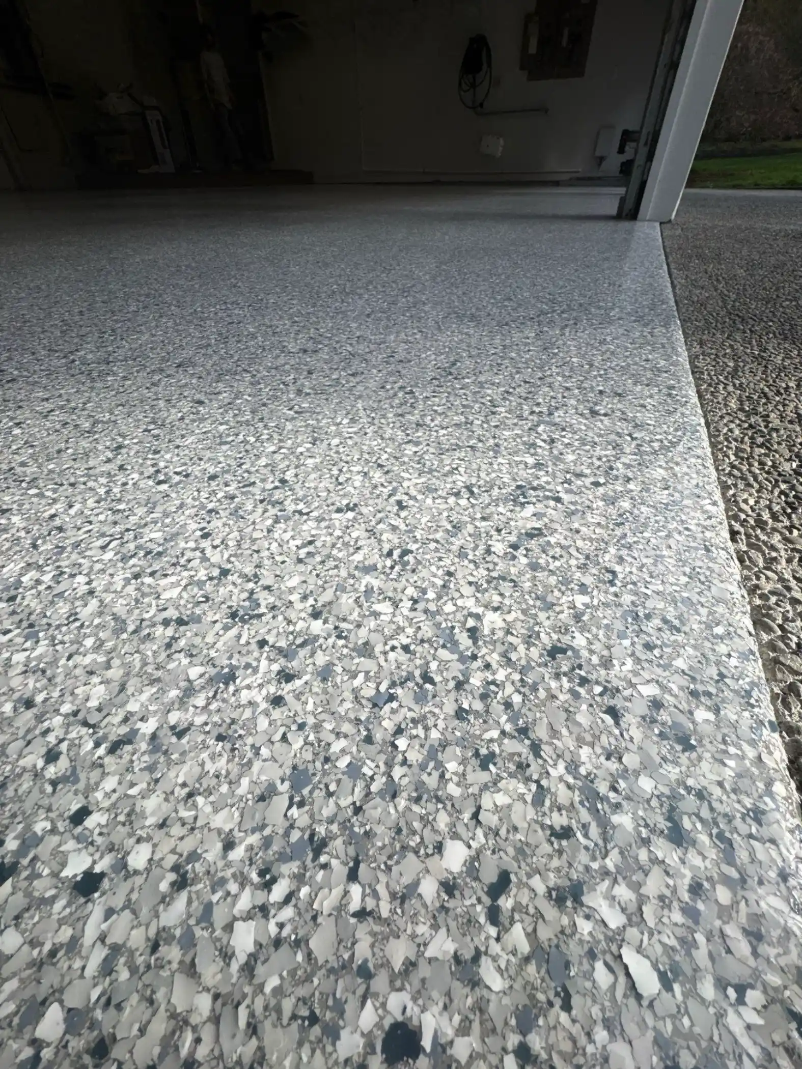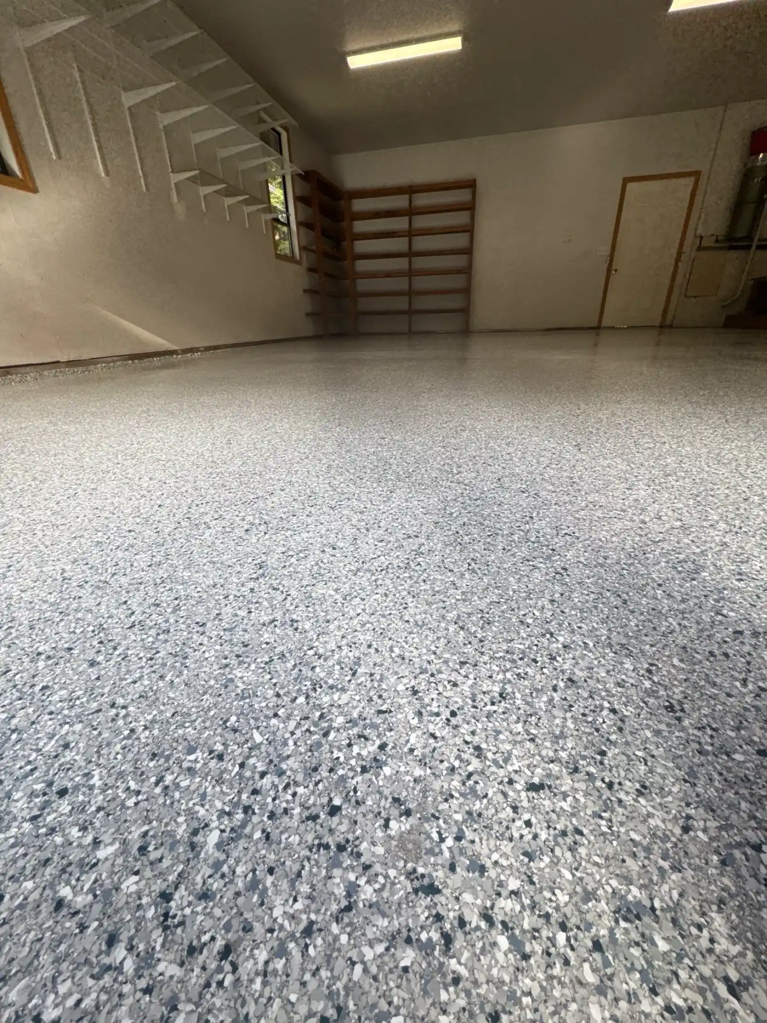 The mixed flake tones in grey, white, and darker charcoal create a balanced appearance that works with the grey base color. Heavy flake coverage like this costs more than minimal flake broadcast, but it delivers better performance and appearance over the coating's lifespan.