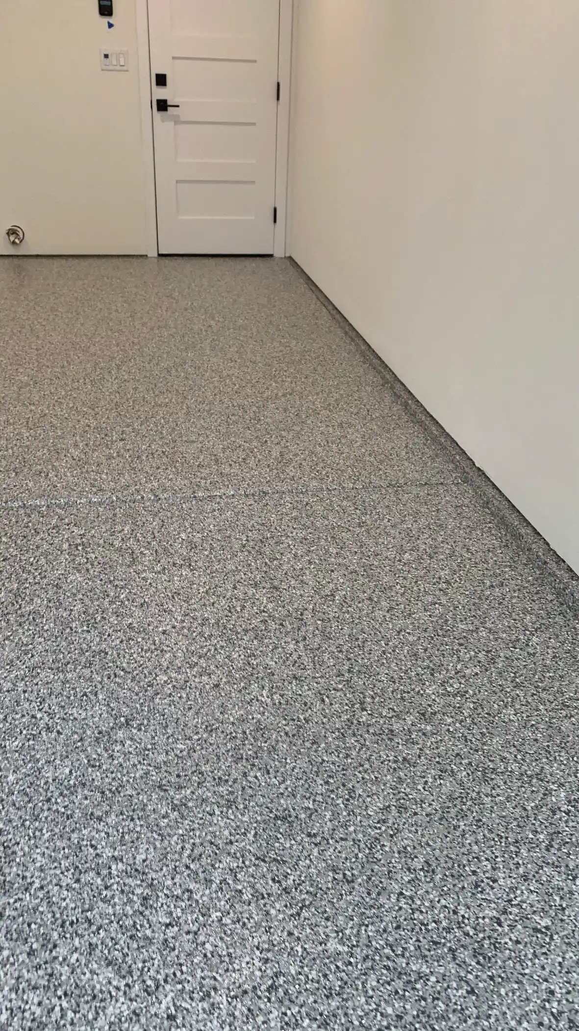 The heavy flake coverage in this garage adds texture and visual depth while serving practical purposes. It hides the minor dirt and tire marks that accumulate over time. The light grey color keeps the garage bright without showing every speck of dust. These details matter when the garage is part of a quality custom home.