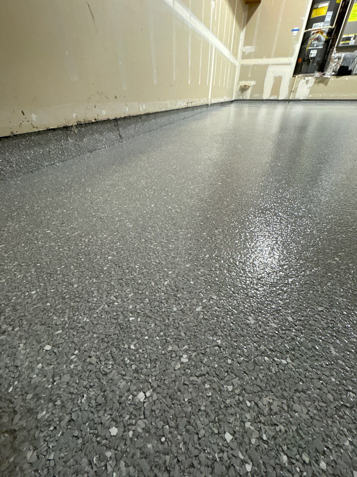 The medium grey color palette with decorative flake broadcast creates visual interest without overwhelming the space. Unlike solid colors that show every speck of dust or tire mark, the flake pattern adds dimension while maintaining that clean, professional appearance. For a homeowner who values organization and aesthetics equally, this combination delivered exactly what they envisioned.
