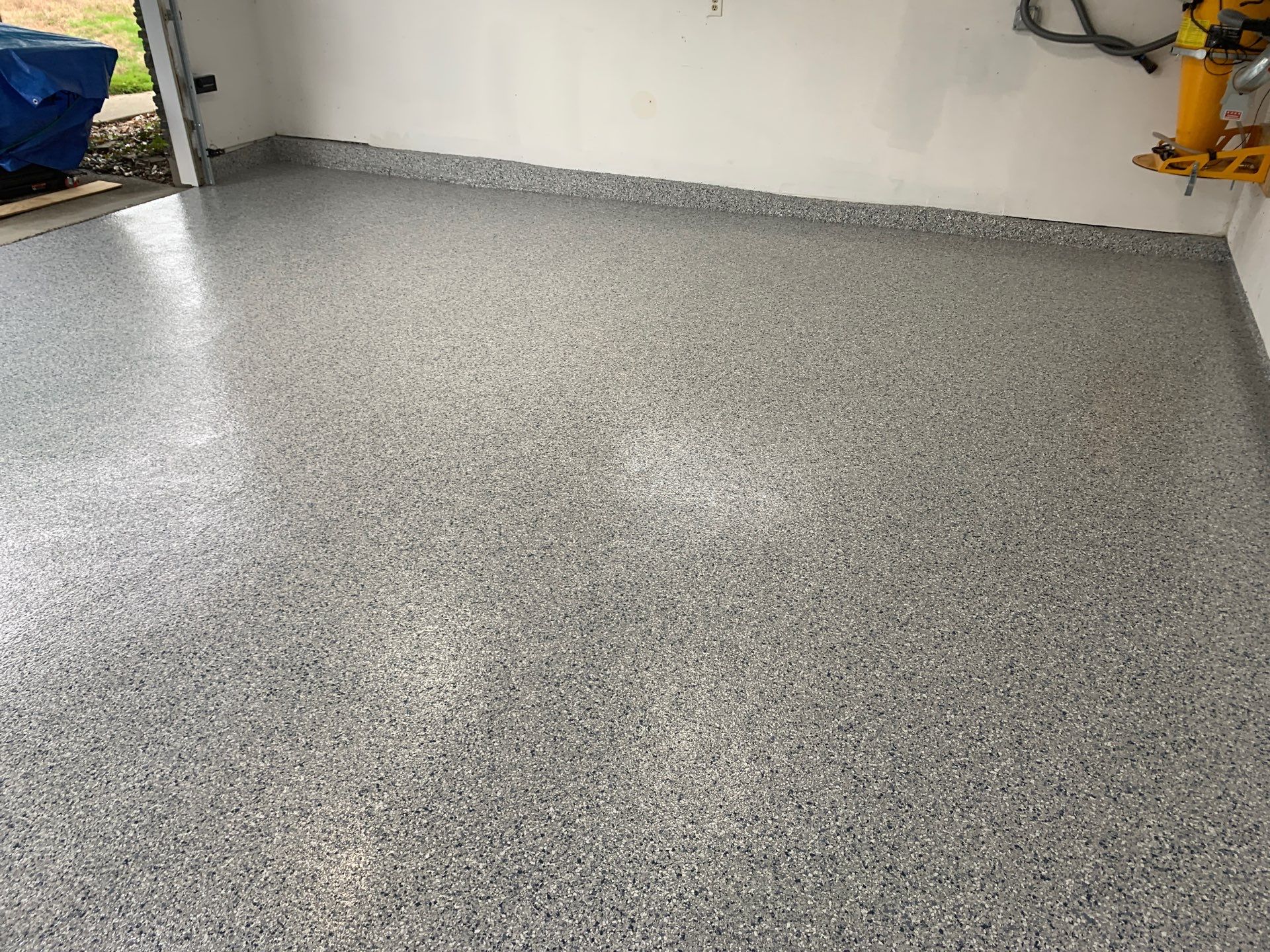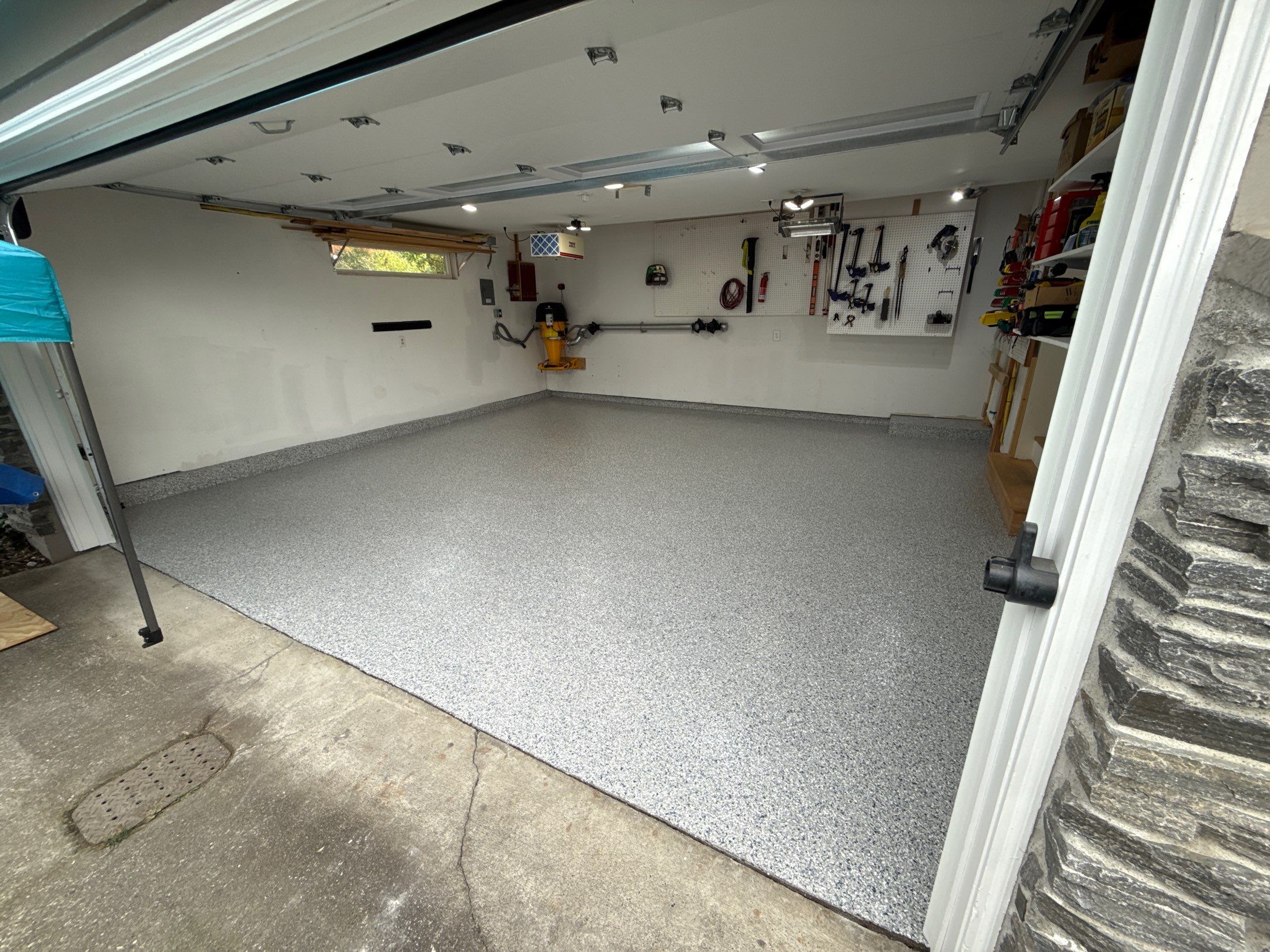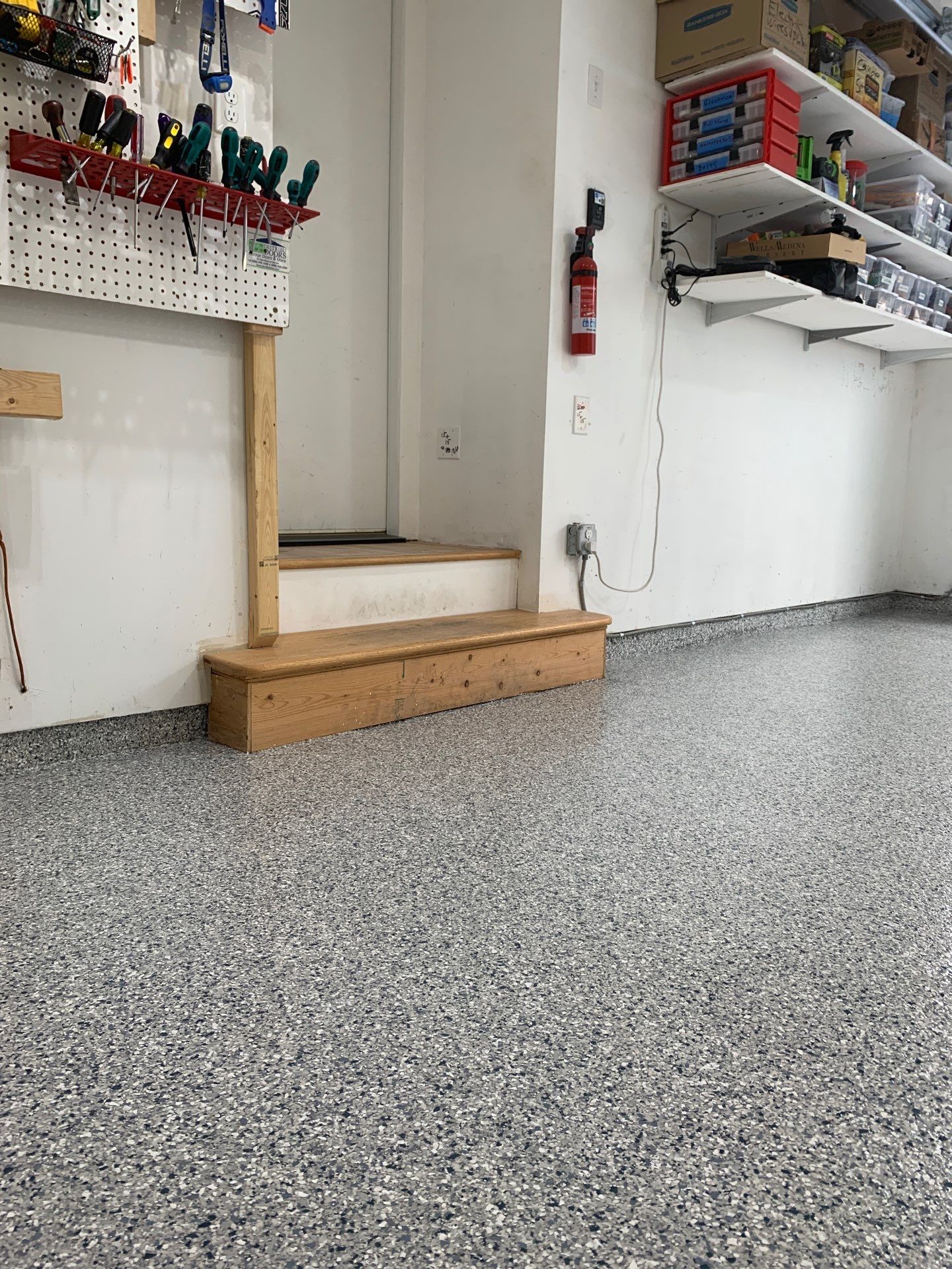 This homeowner selected a classic grey flake pattern that complements the space perfectly—neutral enough to work with any décor, yet sophisticated enough to impress. The multi-toned flake system adds depth and helps camouflage minor dirt between cleanings, making maintenance practically effortless.