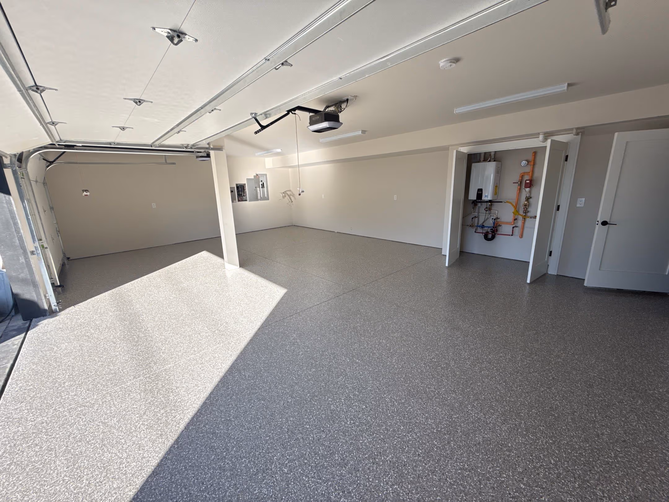 The medium grey finish chosen for this Seattle project provides the perfect balance—light enough to brighten the space and make cleaning easier, while hiding the inevitable dirt and tire marks that come with daily garage use. The subtle decorative flake adds texture and visual interest without overwhelming the clean, modern aesthetic.
